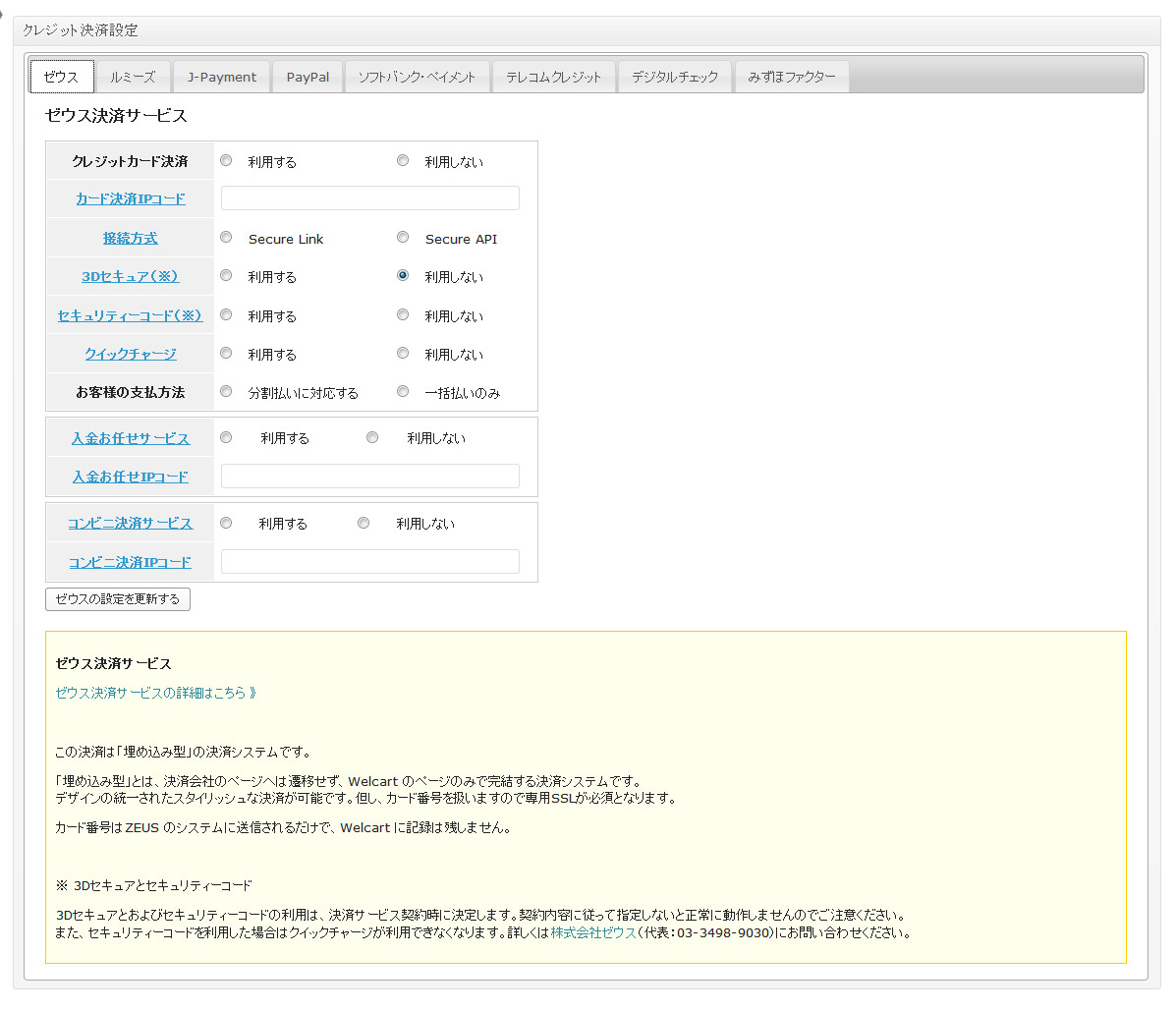 カード番号はZEUS のシステムに送信されるだけで、Welcart に記録は残しません。